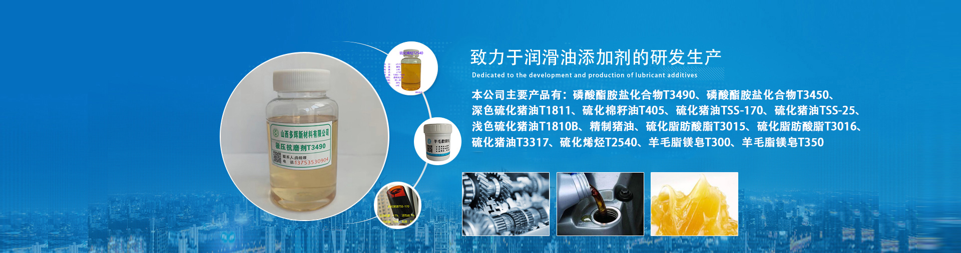 霍州市北方靖博潤(rùn)油品有限責(zé)任公司坐落于風(fēng)景秀麗的霍山腳下,公司所處地理位置交通便利,距離霍州高速15公里。公司自2007年經(jīng)環(huán)保等相關(guān)部門(mén)批準(zhǔn)成立,注冊(cè)資金500萬(wàn)元。一直致力于潤(rùn)滑油添加劑的研發(fā)生產(chǎn),本公司主要產(chǎn)品有硫化豬油1810B,硫化豬油1811,硫化脂肪酸脂T3015,硫化棉籽油T405,精制豬油,硫化豬油碳?xì)浠衔颰226(S=17%),硫化烯烴(S=36%),極壓抗磨劑T349,極壓抗磨劑T306,極壓抗磨劑T308等一系列產(chǎn)品。并且具有硫化豬油1810B,冬天流動(dòng)性好,硫化豬油1811,氣味輕等優(yōu)勢(shì)。公司奉行“誠(chéng)信、紀(jì)律、服務(wù)、創(chuàng)新”的企業(yè)精神,讓利于客戶(hù),服務(wù)好客戶(hù);公司堅(jiān)持自主創(chuàng)新的原則,開(kāi)發(fā)近十多個(gè)精細(xì)化工產(chǎn)品,同時(shí),積極與國(guó)內(nèi)知名院校和科研機(jī)構(gòu)展開(kāi)合作,研發(fā)具有核心競(jìng)爭(zhēng)力的高新技術(shù)產(chǎn)品,目前,公司在技術(shù)創(chuàng)新和環(huán)境保護(hù)方面取得了顯著的進(jìn)步。經(jīng)營(yíng)理念,誠(chéng)信為生存之本,創(chuàng)新是動(dòng)力之源。